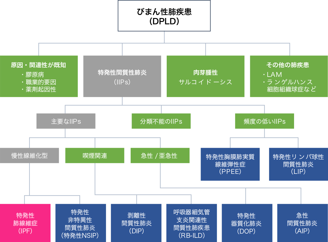 間質性肺炎の原因には、関節リウマチや多発性皮膚筋炎などの膠原病(自己免疫疾患)、職業上や生活上での粉塵(ほこり)やカビ・ペットの毛・羽毛などの慢性的な吸入(じん肺や慢性過敏性肺炎)、病院で処方される薬剤・漢方薬・サプリメントなどの健康食品(薬剤性肺炎)、特殊な感染症など様々あることが知られていますが、原因を特定できない間質性肺炎を「特発性間質性肺炎(idiopathic interstitial pneumonia;IIPs)」といいます。IIPsは主要な6つの病型、稀な2つの病型および分類不能型に分類されます。