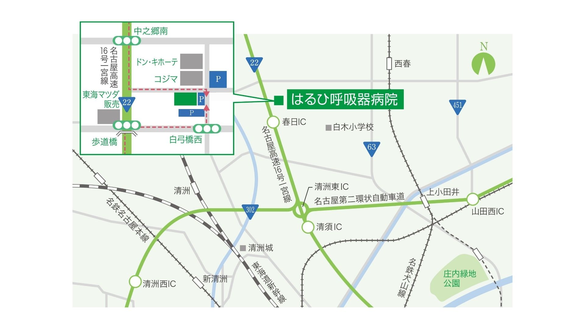 ・名古屋鉄道犬山線「西春駅」下車、タクシーまたは下記の無料送迎車で約10分、もしくは「きたバス」つつじ(南部)線右回りで約25分、左回りで約50分、「はるひ呼吸器病院」下車すぐ、目の前